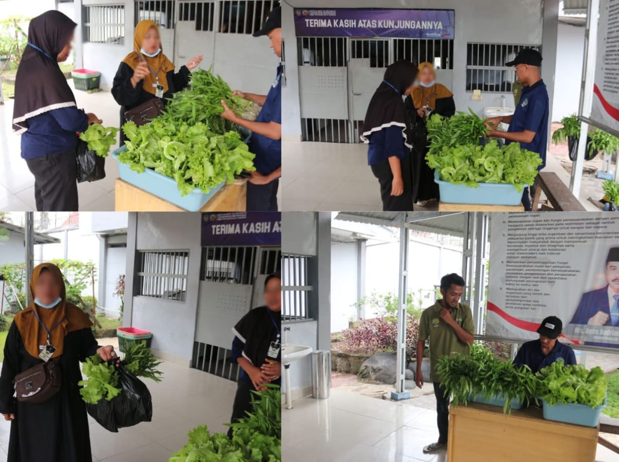 Suasana hangat tampak di area depan bengkel kerja (Bengker) Lapas Kelas IIA Banjarmasin, Kamis (30/10). Beberapa Tamping Giatja tampak sigap menjajakan hasil panen sayur segar kepada para pengunjung dan tamu yang datang.