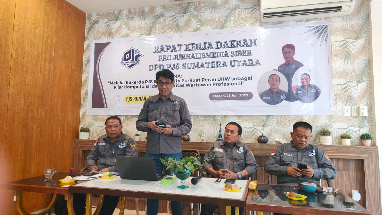 DetikTimes || MEDAN, SUMUT – Dewan Pimpinan Daerah (DPD) Pro Jurnalismedia Siber (PJS) Sumatera Utara menggelar Rapat Kerja Daerah (Rakerda) I yang dibuka langsung oleh Ketua Umum Dewan Pimpinan Pusat (DPP) PJS, Mahmud Marhaba, bertempat di Deli Kede Kopi, Jalan Dolok Sanggul, Medan, Sabtu (28/6/2025).