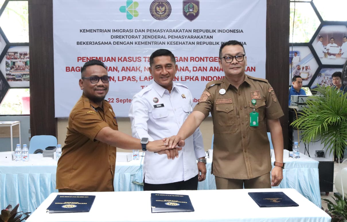 Sebagai bentuk nyata sinergi lintas sektor dalam mendukung program nasional eliminasi TBC tahun 2030, Lapas Narkotika Kelas IIA Karang Intan menjalin perjanjian kerja sama dengan Dinas Kesehatan Kabupaten Banjar dan Puskesmas Karang Intan 1. Penandatanganan perjanjian kerja sama ini dilakukan bersamaan dengan kegiatan pembukaan skrining Tuberkulosis (TBC) melalui rontgen dada di Aula Kunjungan Lapas, Senin (22/9).
