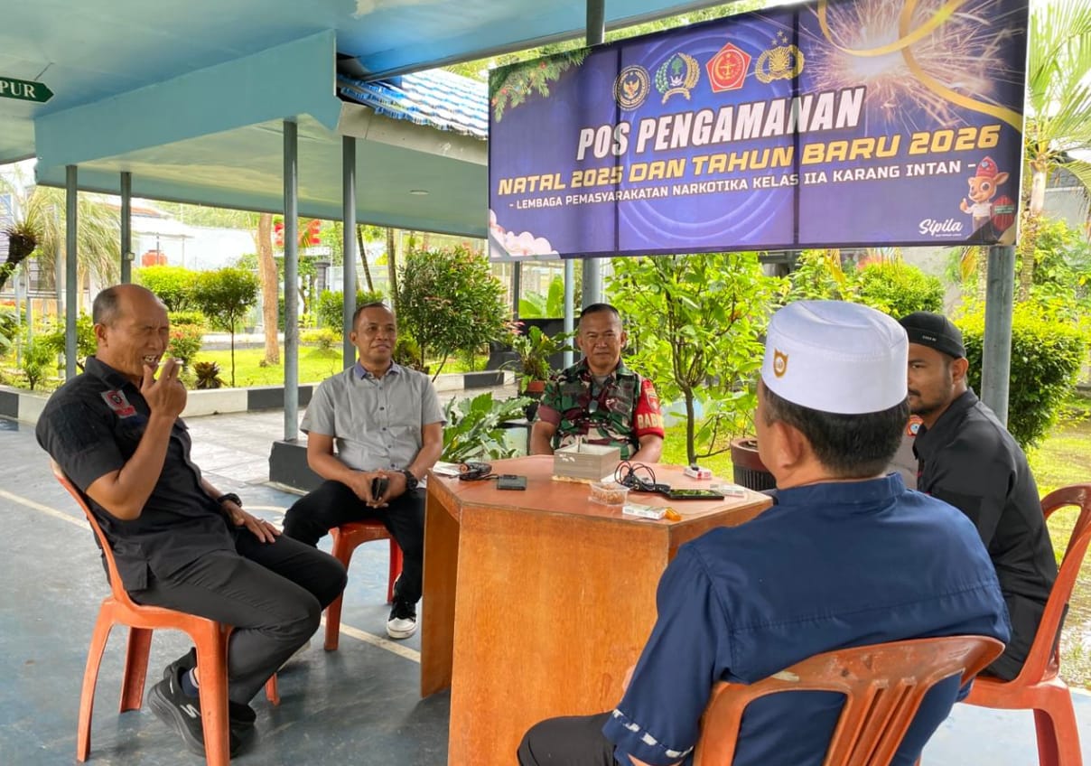 Unsur TNI dan Polri melaksanakan kegiatan sambang dan pengecekan Pos Pengamanan Tahun Baru 2026 di Lembaga Pemasyarakatan (Lapas) Narkotika Kelas IIA Karang Intan, Kamis (1/1). Kegiatan sambang tersebut bertujuan memperkuat sinergi lintas sektor serta memastikan situasi keamanan dan ketertiban di lingkungan lapas tetap aman dan kondusif selama momentum pergantian tahun.