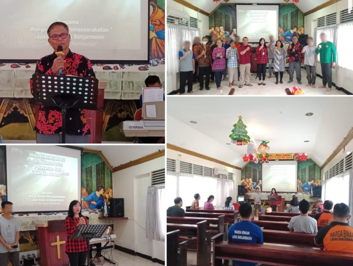 Warga binaan pemasyarakatan (WBP) Kristiani Lembaga Pemasyarakatan (Lapas) Kelas IIA Banjarmasin mengikuti Ibadah Rutin Bulanan Pelayanan dari Gereja Advent yang digelar di Gereja Oikumene Lapas, Rabu (20/08).